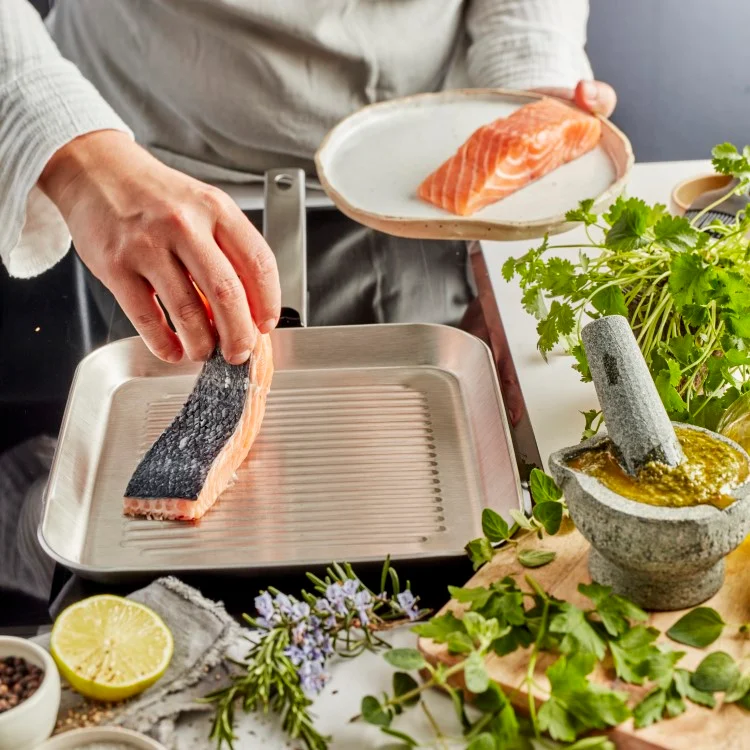 Geef je je steak, burgers, zalm of sardines graag een extra touch? Door ze te grillen krijgen ze een nog krachtigere smaak en een heerlijke look met typische roosterstreepjes. Deze Demeyere Grillpan Specialties 3 24 x 24 cm is geschikt voor alle kookplaten, ook inductie. Ze warmt sneller op dan een gietijzeren exemplaar en weegt minder, waardoor ze makkelijk te hanteren is.