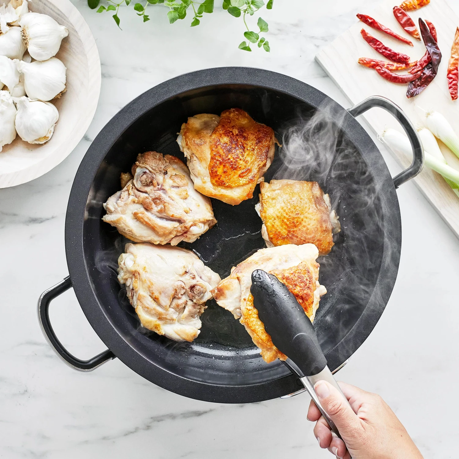 Pannen met een keramische aanbaklaag zijn bestand tegen temperaturen tot 400 โ en zorgen voor een krokant laagje om je ingrediรซnten. Hierdoor zijn deze pannen met name geschikt voor het bakken van vlees en groenten. Het laagje keramiek moet met de hand gereinigd worden en kan dus niet in de vaatwasser.