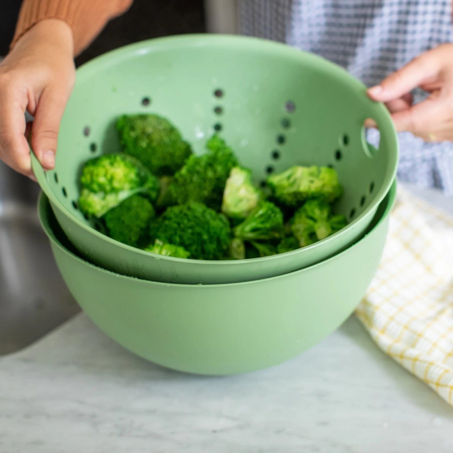 De Koziol Vergiet Palsby Kunststof Groen ø 29 cm is perfect om noedels, pasta, groente of fruit af te gieten of af te spoelen. Het vergiet van Koziol past perfect in de beslagkom van 5 Liter van Palsby om ruimte te besparen. De perforaties zijn stervormig wat het gietproces sneller laat verlopen en het reinigen makkelijker maakt. Hij kan schoongemaakt worden in de vaatwasser.