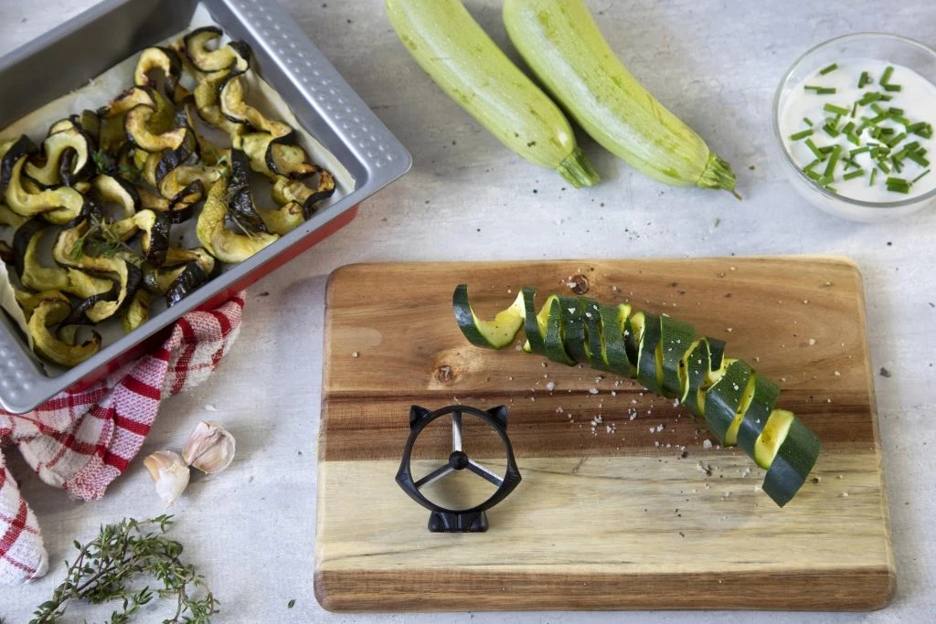 Komkommers en courgettes hebben geen schijn van kans, Curly Cat is op jacht! Draai er een door de messen van Curly Cat en zie de magie gebeuren! Je houdt perfecte groentekrullen over om je bord te versieren of je favoriete drankje te garneren.