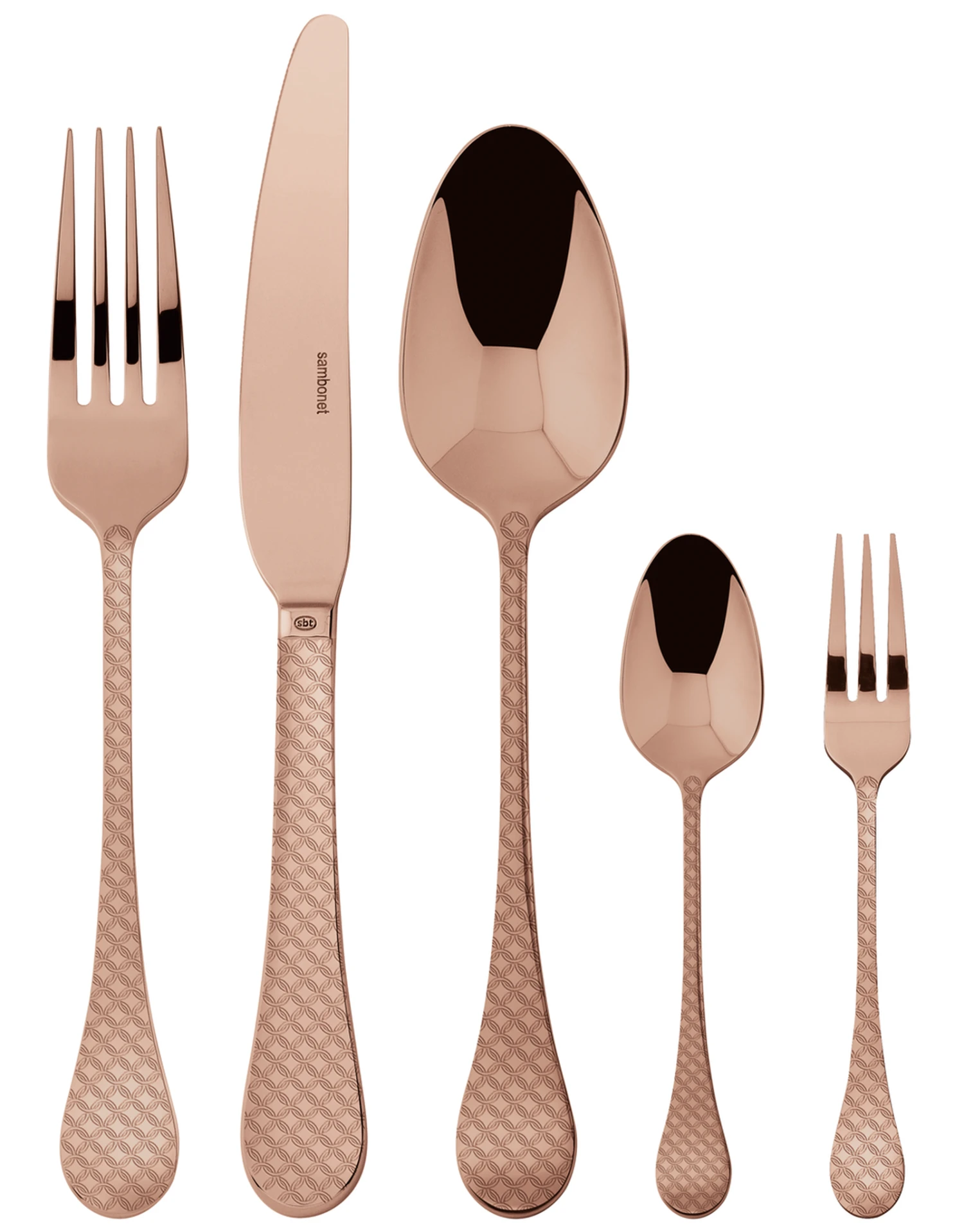 Kies voor een prachtig gedekte tafel met dit Sambonet Taormina bestek. Deze bestekset zal je gasten verrassen! Dankzij de print op het handvat is dit bestek net even anders dan je andere bestek. Kies uit de verschillende kleuren: goud, zwart, zilver of koper. Combineer de bestekset bijvoorbeeld met de koffielepels of gebaksvorkjes, of kies voor een andere collectie van Sambonet! Deze set bestaat uit: