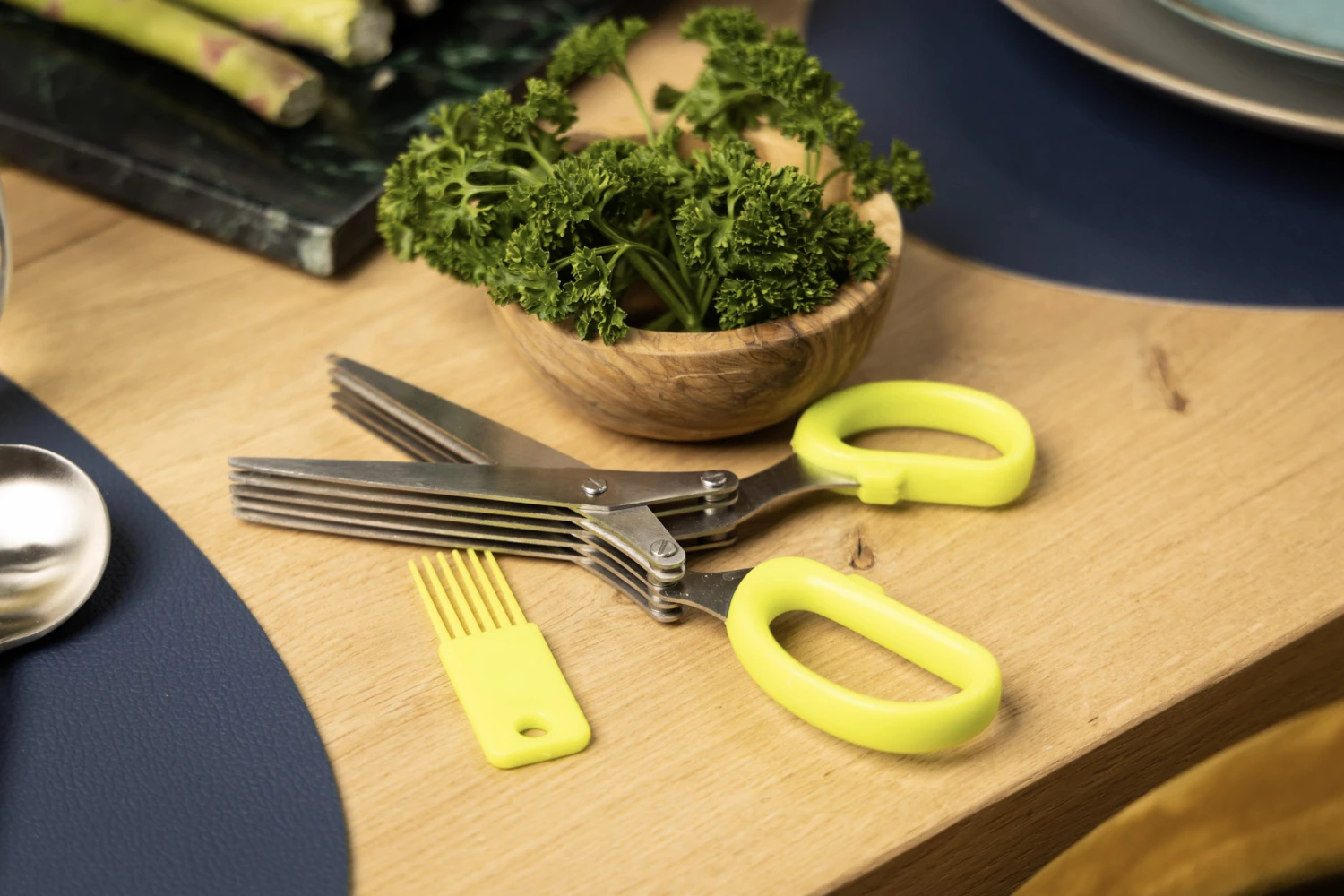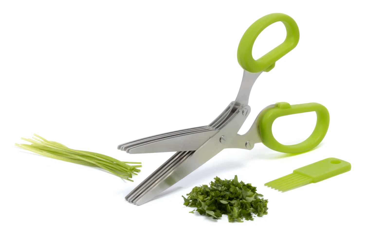 Verse kruiden maken gerechten nog lekkerder! Knip deze kruiden nu eenvoudig fijn, in plaatst van het fijn snijden. Het knippen van kruiden met kruidensnijders en -scharenย gaat een stuk gemakkelijker en is in een handomdraai gebeurd. Gebruik hiervoor deย Cookinglife Kruidenschaar – 5 messen. Deze kruidenschaar is voorzien van 5 scherp geslepen RVS messen waarmee jij kruiden als bieslook, peterselie of munt fijn kan knippen. Daarnaast word de kruidenschaar geleverd met een klein kammetje, hiermee kan je restjes kruiden die nog in de messen van de schaar blijven zitten gemakkelijk verwijderen.