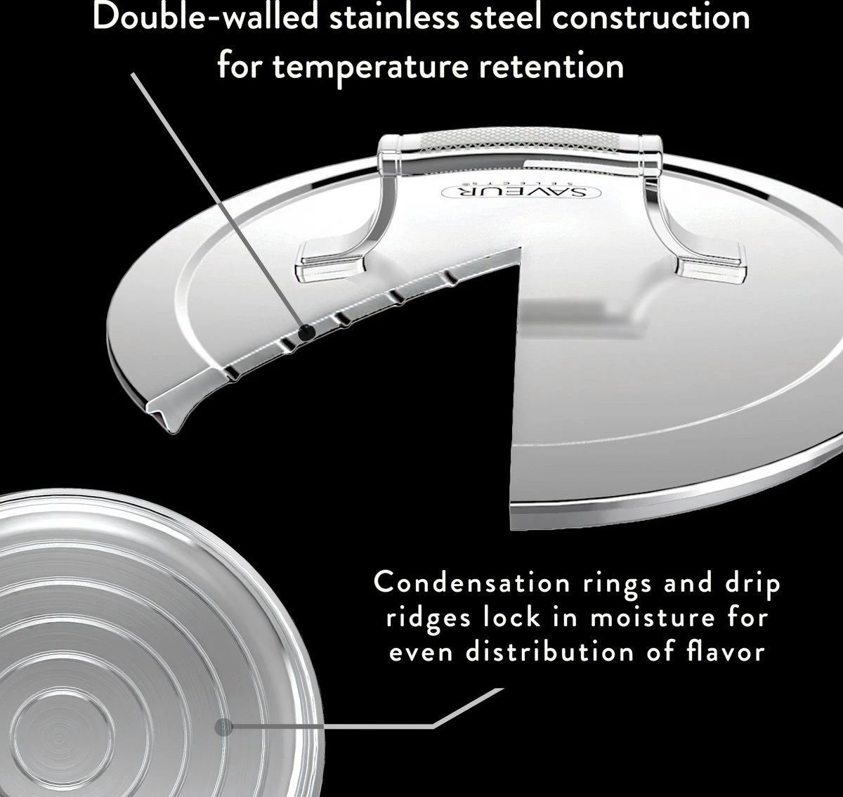 INNOVATIEF, DUBBELWANDIG DEKSEL – Roestvrijstalen deksel zorgt voor een gelijkmatig temperatuurbehoud; de condens ringen en druipranden houden vocht vast en verdelen de smaak gelijkmatig